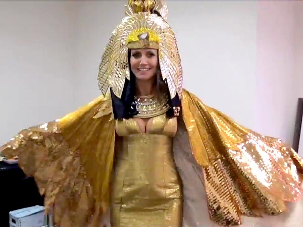 The intricate ensemble boasts a crystal-covered headpiece, a racy, cleavage-baring gold gown and a feathered cape. And amazingly, the designer promises it wont eve! n be all that heavy which is good since shell be dancing the night away at her annual Halloween party in New York.